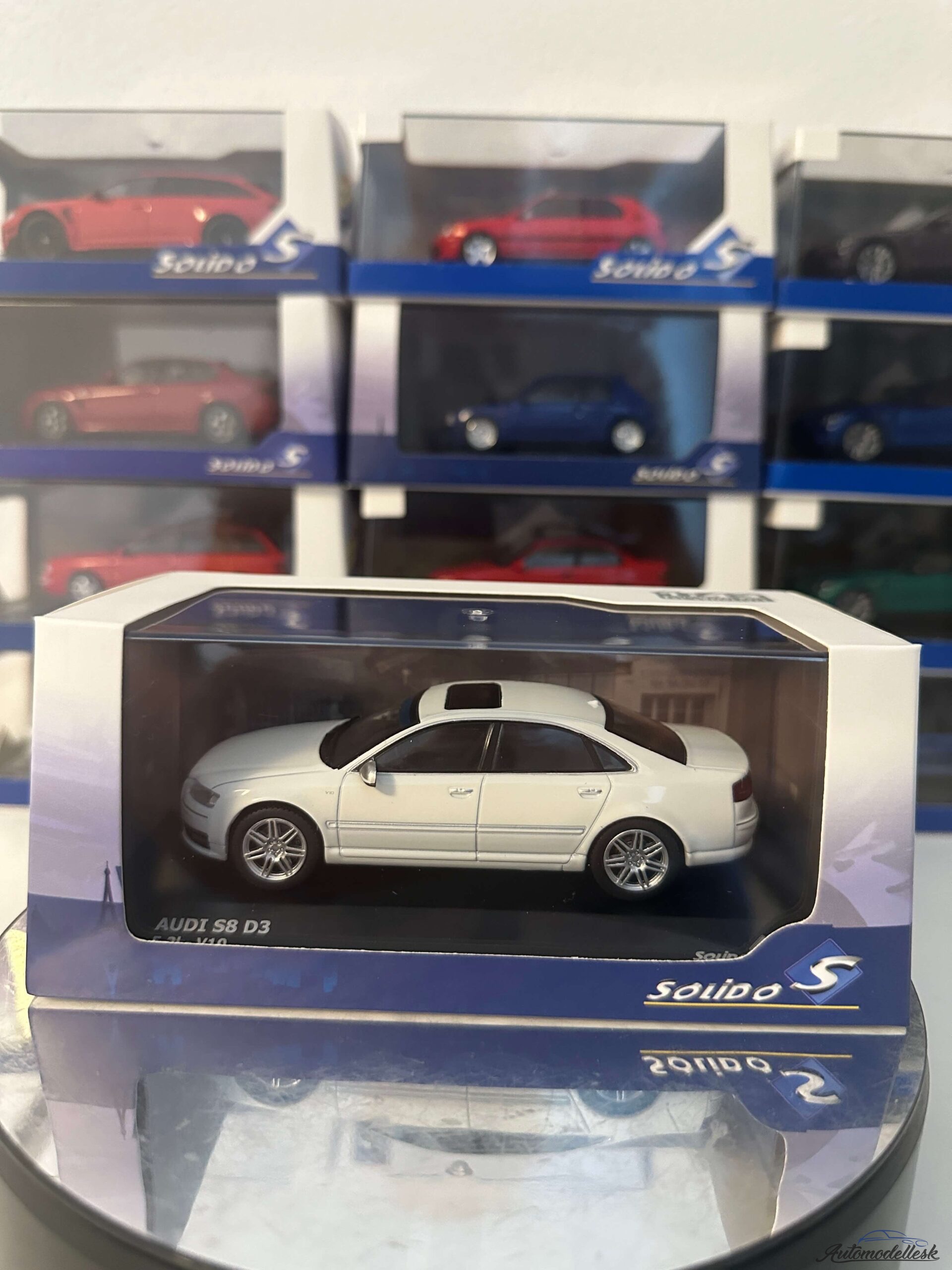 Model auta Audi S8 (D3), biela, 2010. Mierka 1:43. Solido. Balenie model je na podstavci vo vitríne s papierovým prebalom.