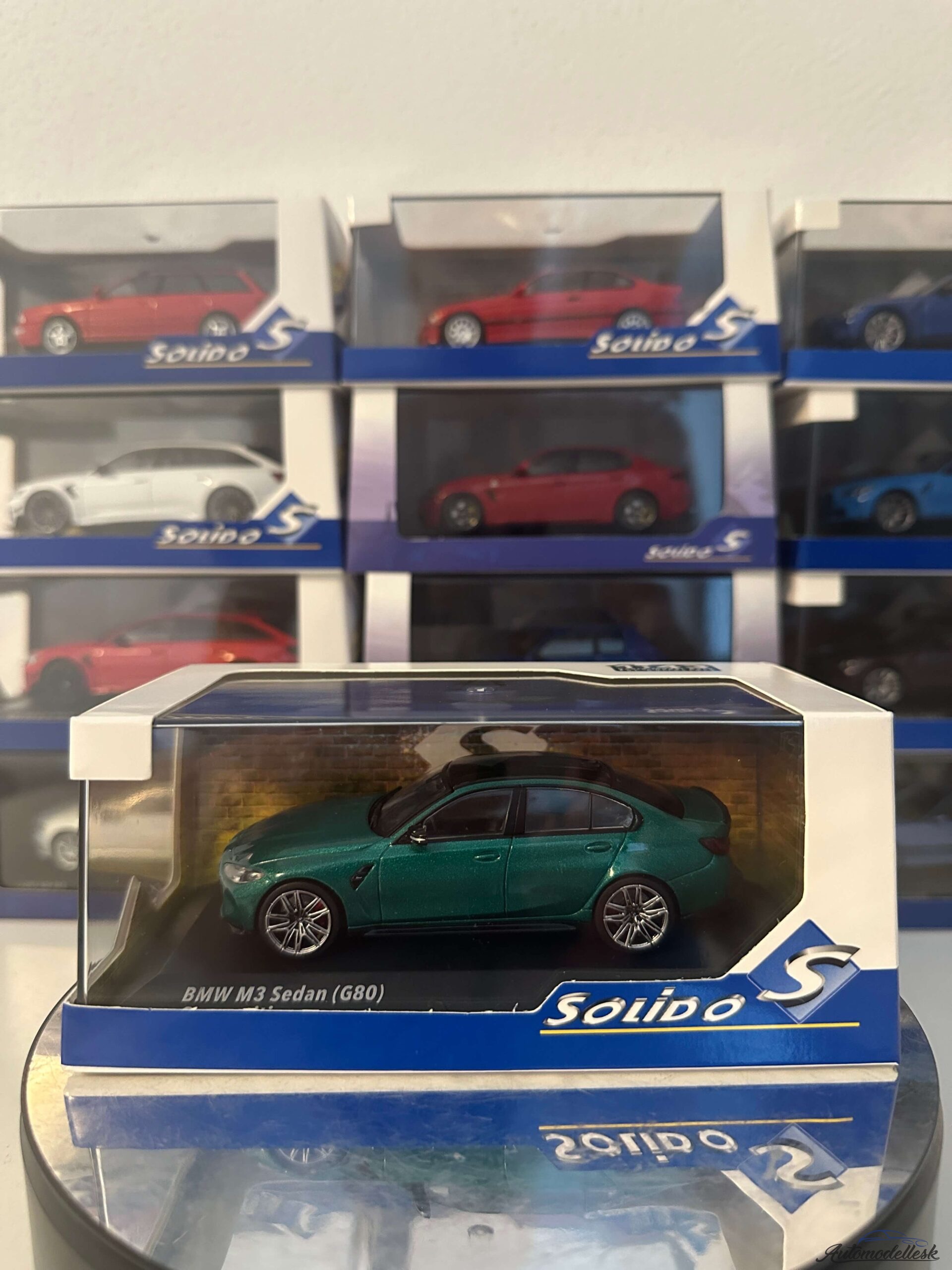 Model auta Bmw G80 M3 Sedan M Isle of Man Green, 2023. Mierka 1:43. Solido. Balenie model je na podstavci vo vitríne s papierovým prebalom.