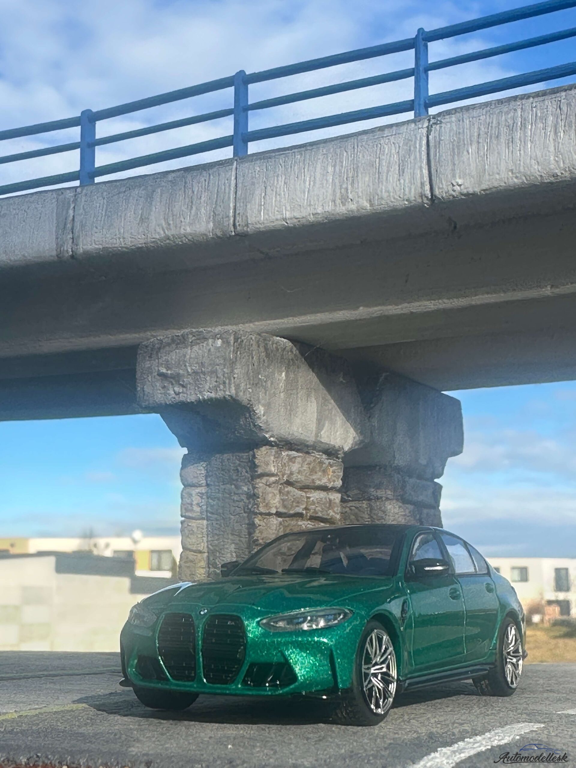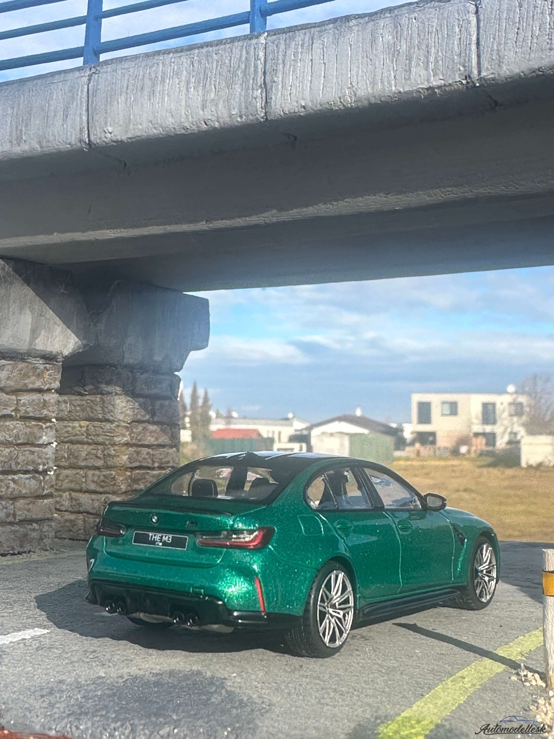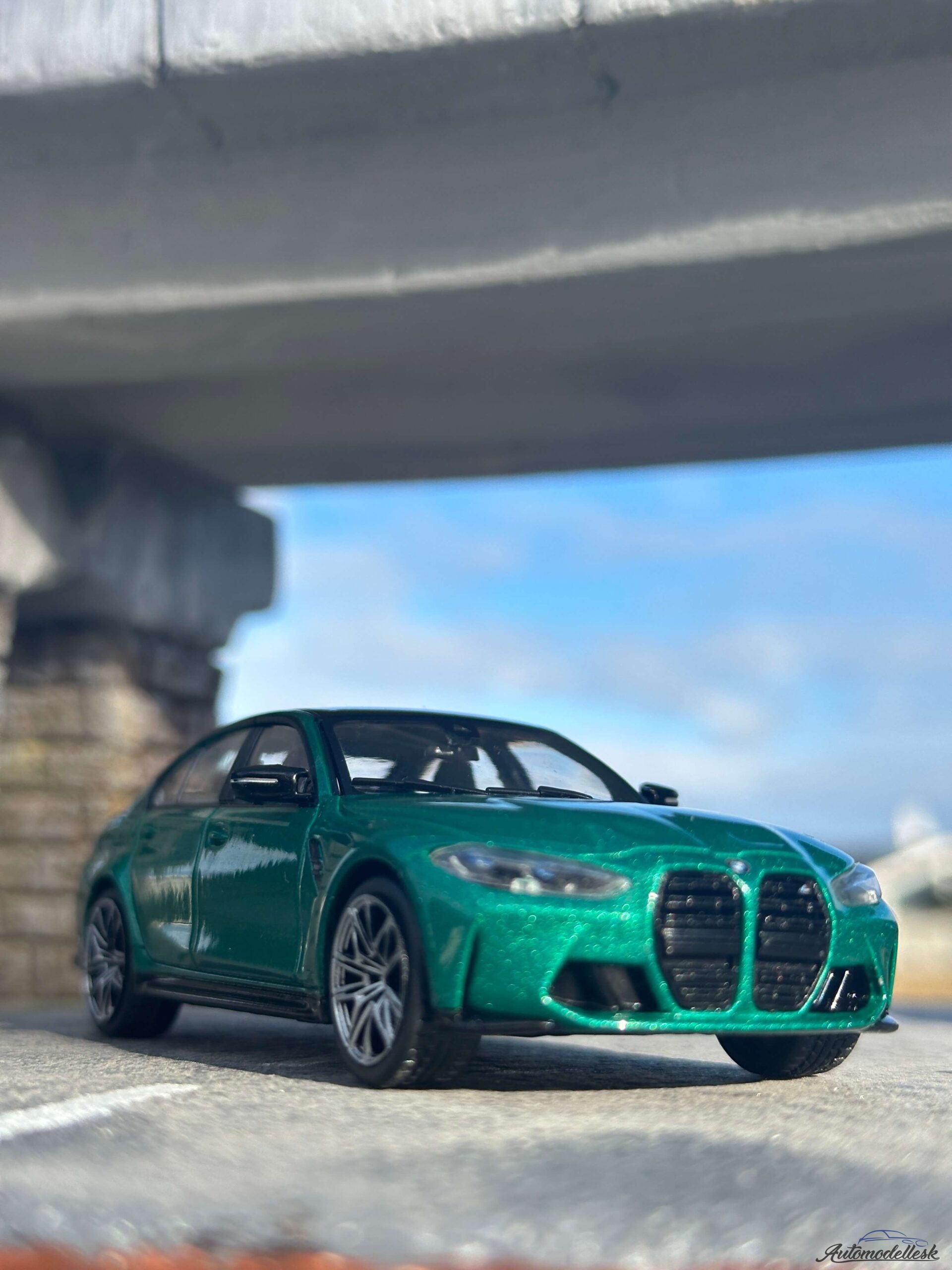 - Detailné spracovanie: Model verne reprodukuje moderný dizajn BMW G80 M3 Sedan v elegantnej farbe Isle of Man Green, typickej pre túto edíciu.