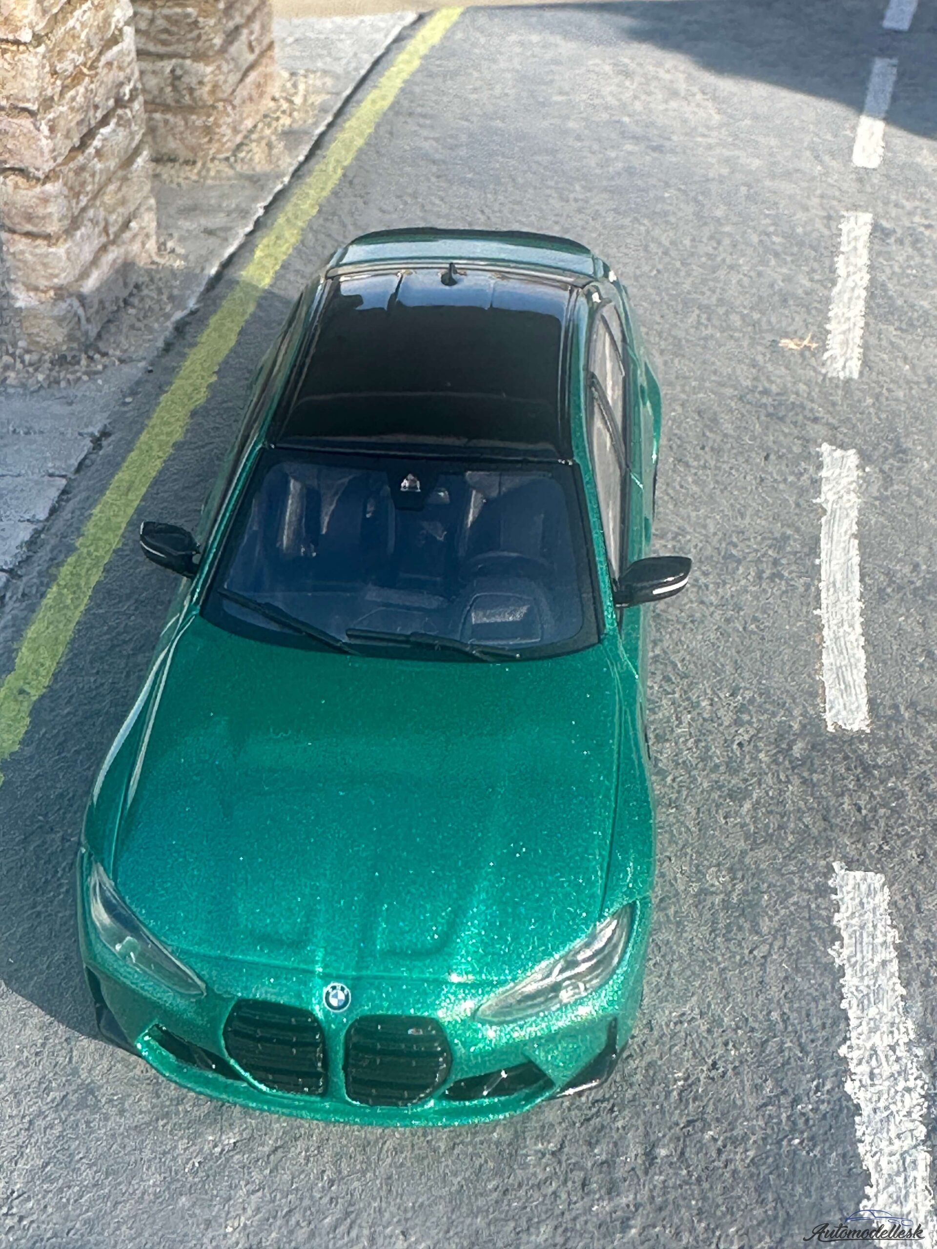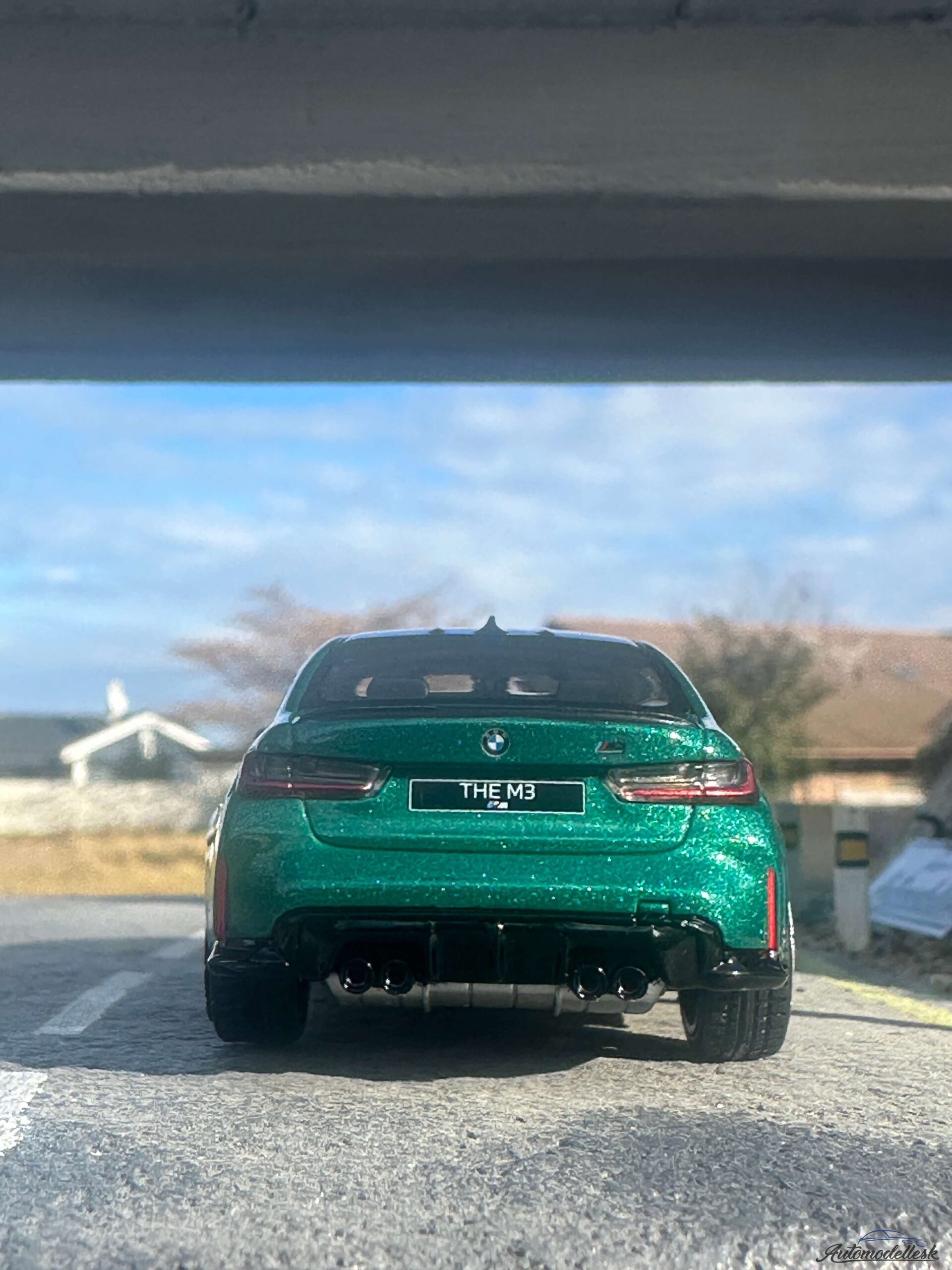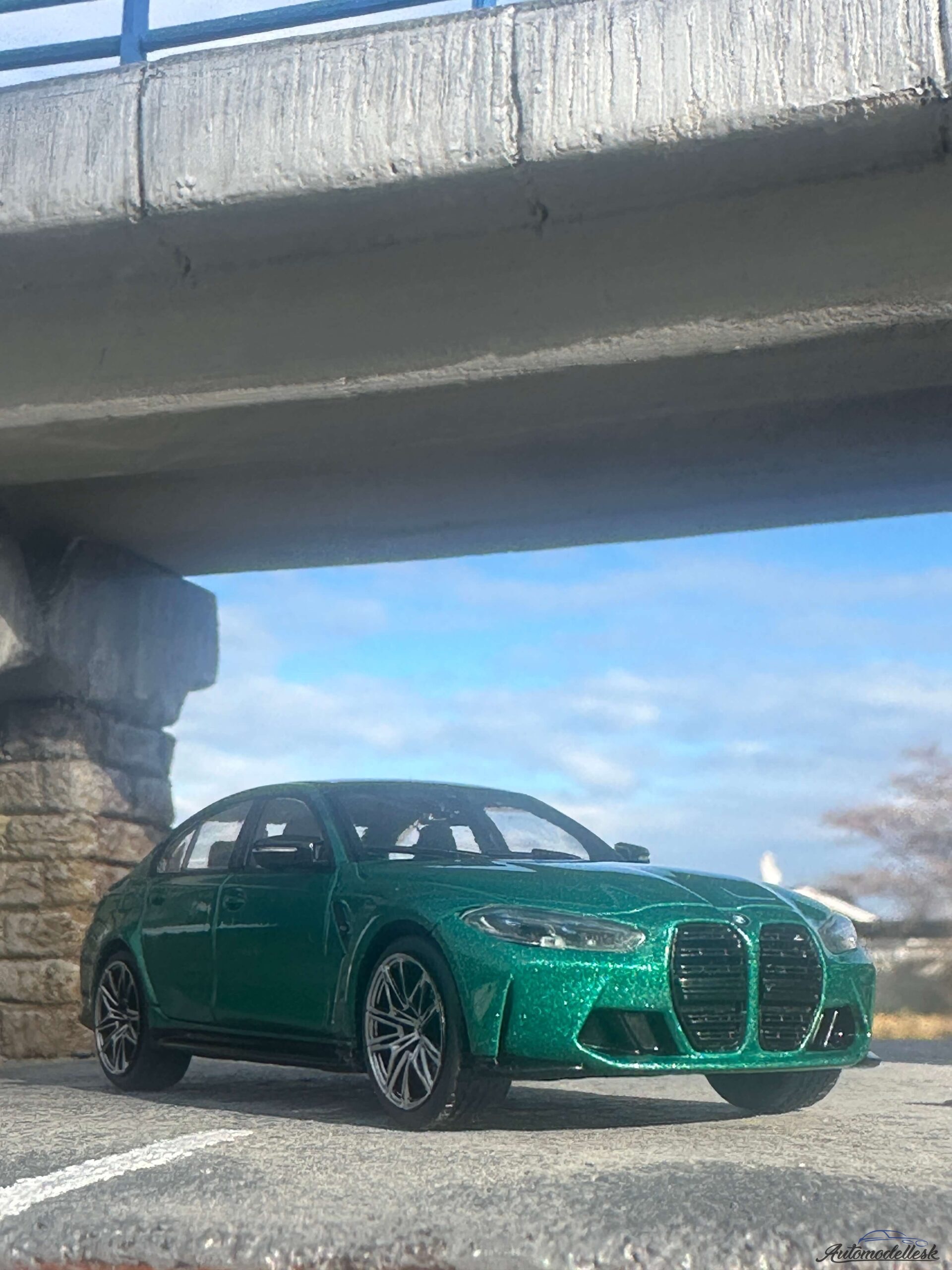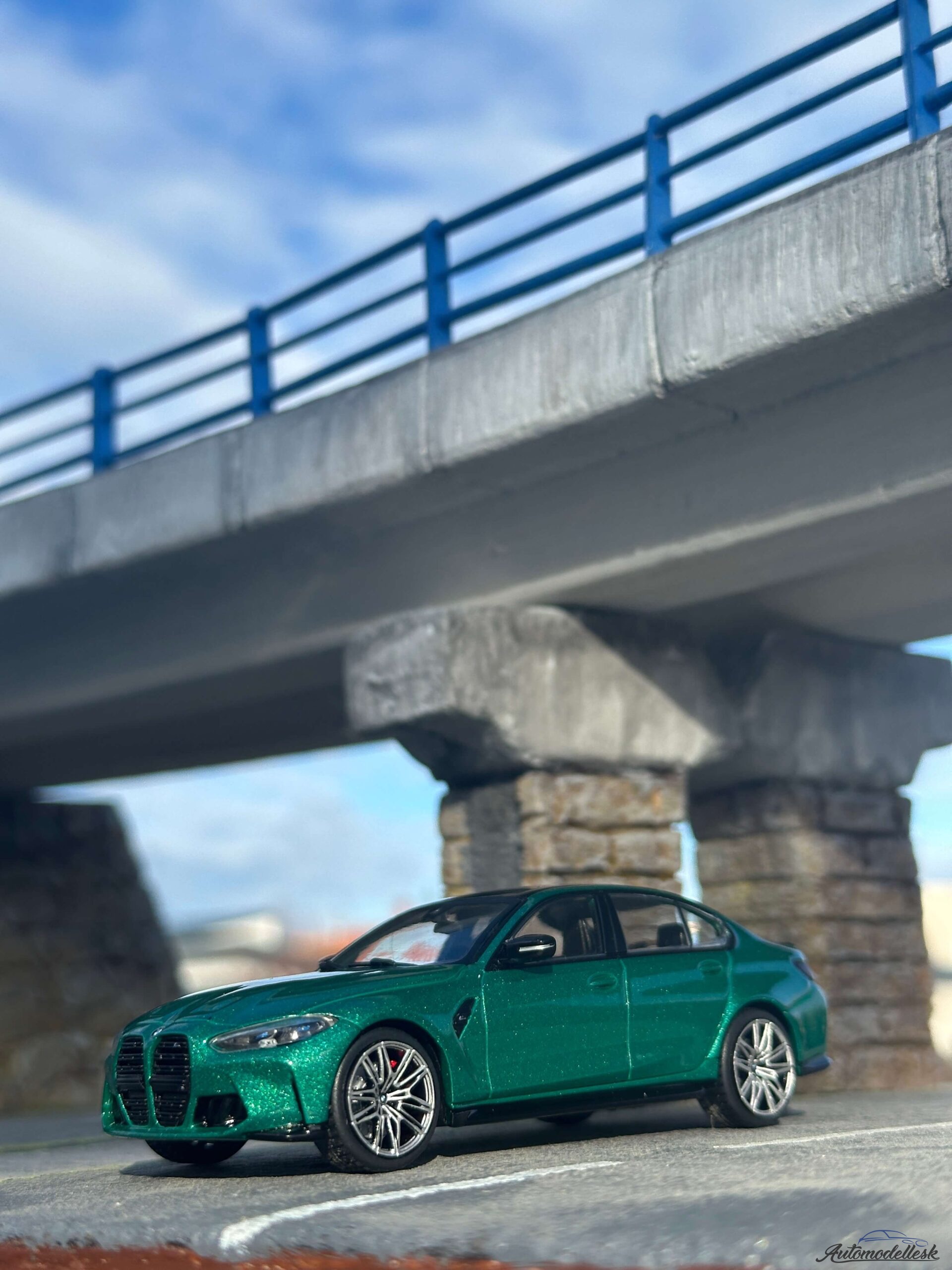 - Detailné spracovanie: Model verne reprodukuje moderný dizajn BMW G80 M3 Sedan v elegantnej farbe Isle of Man Green, typickej pre túto edíciu.