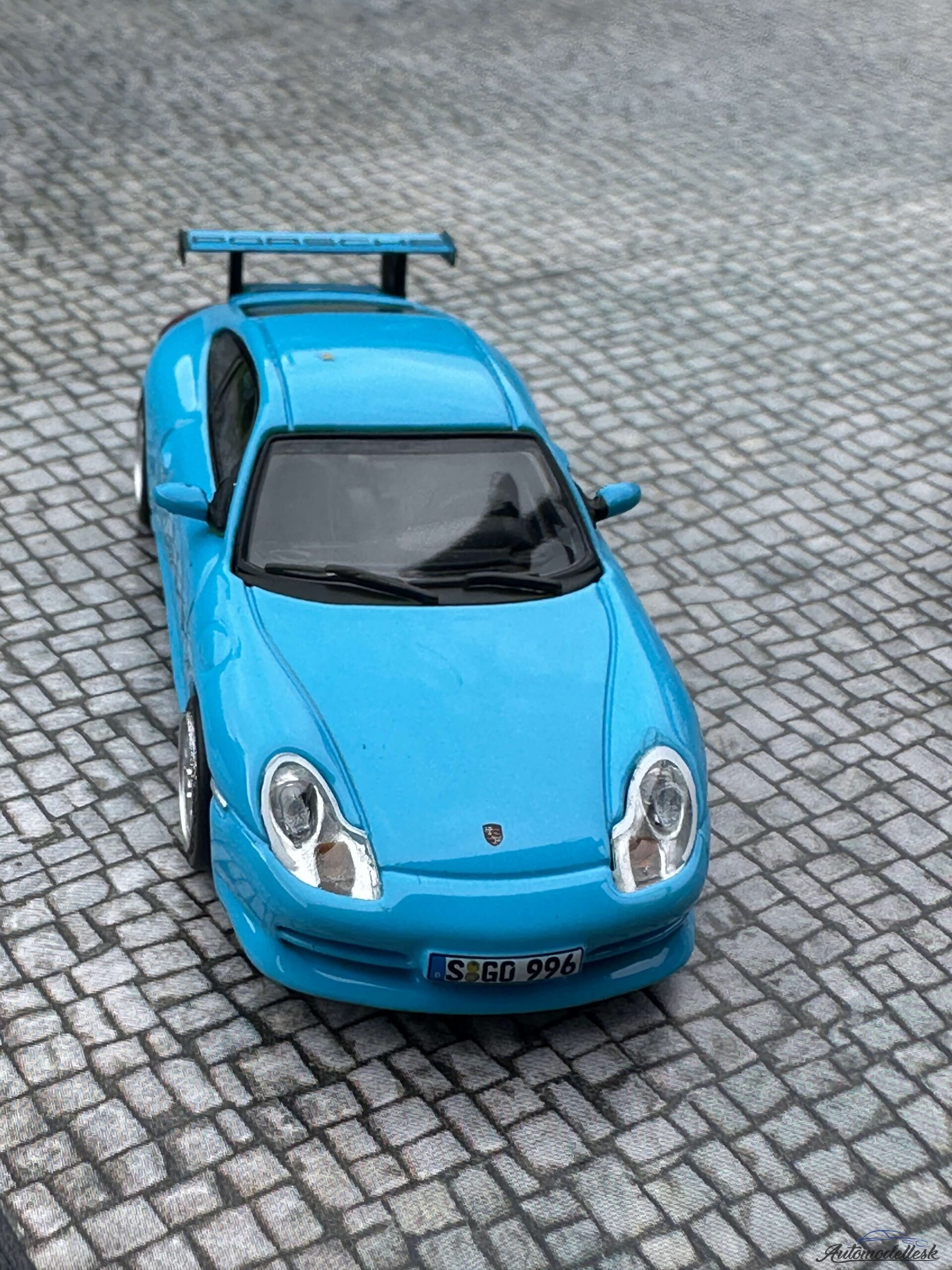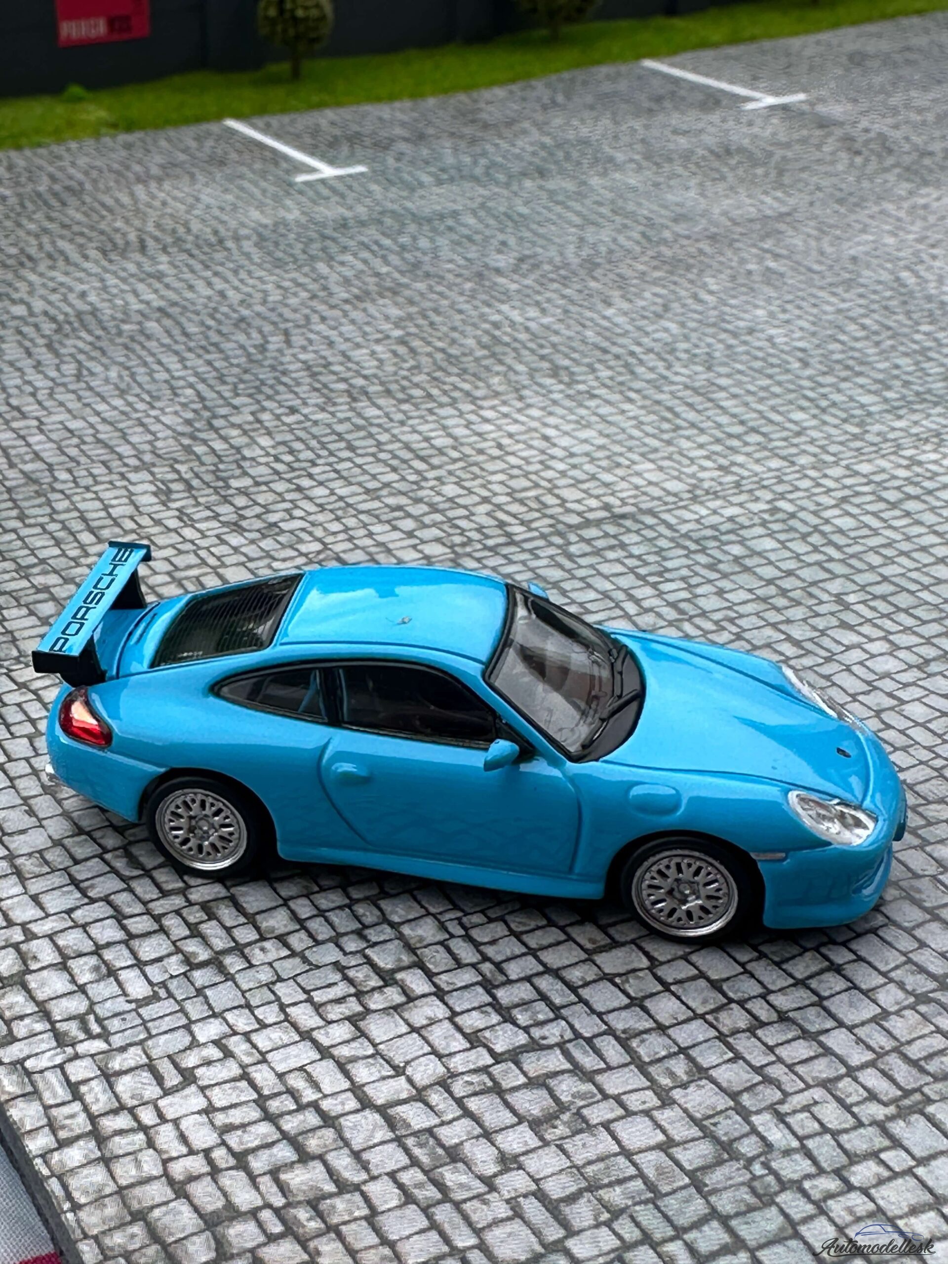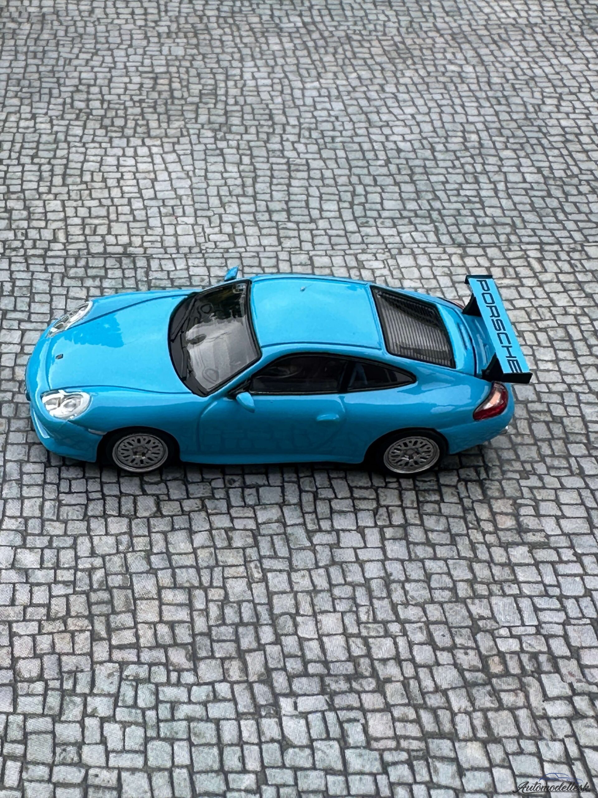 Model auta Porsche 911 GT3 (996), svetlo modrá. Mierka 1:64.