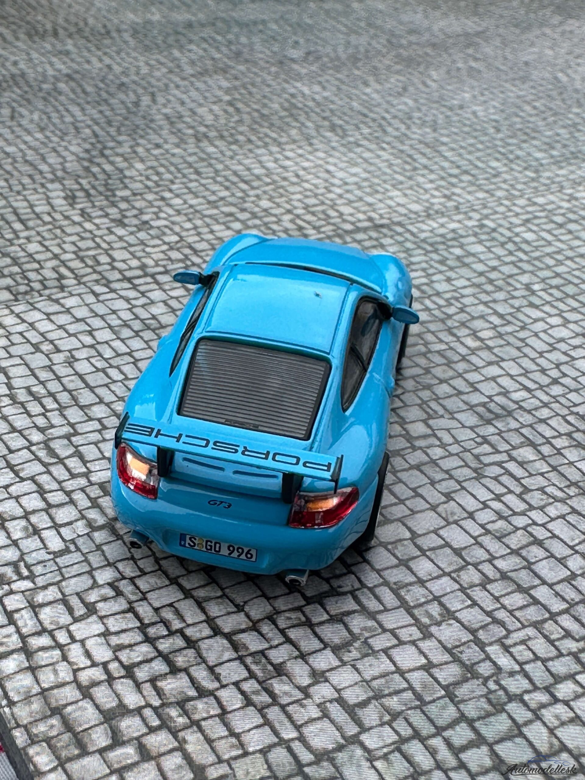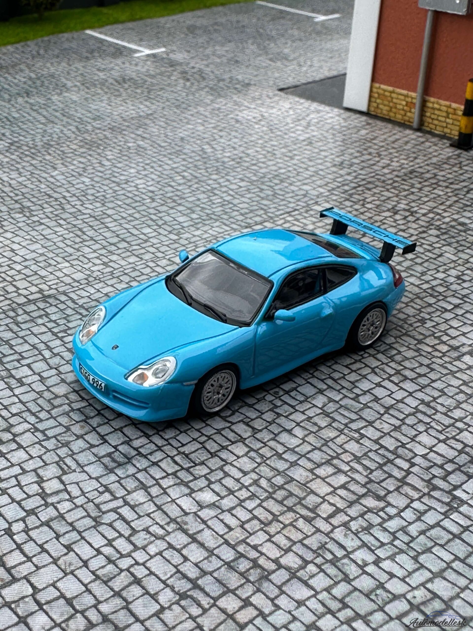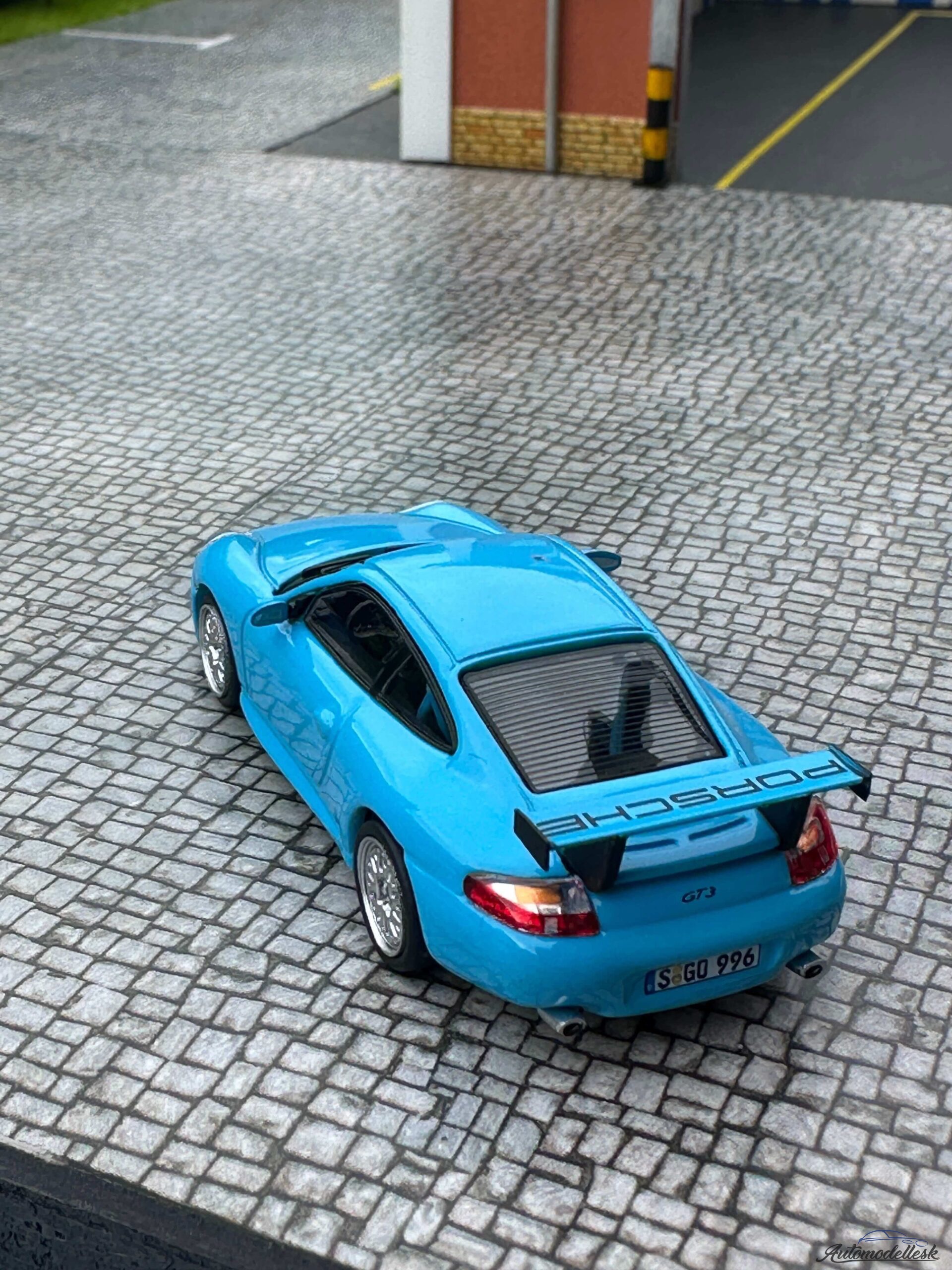 Model auta Porsche 911 GT3 (996), svetlo modrá. Mierka 1:64.