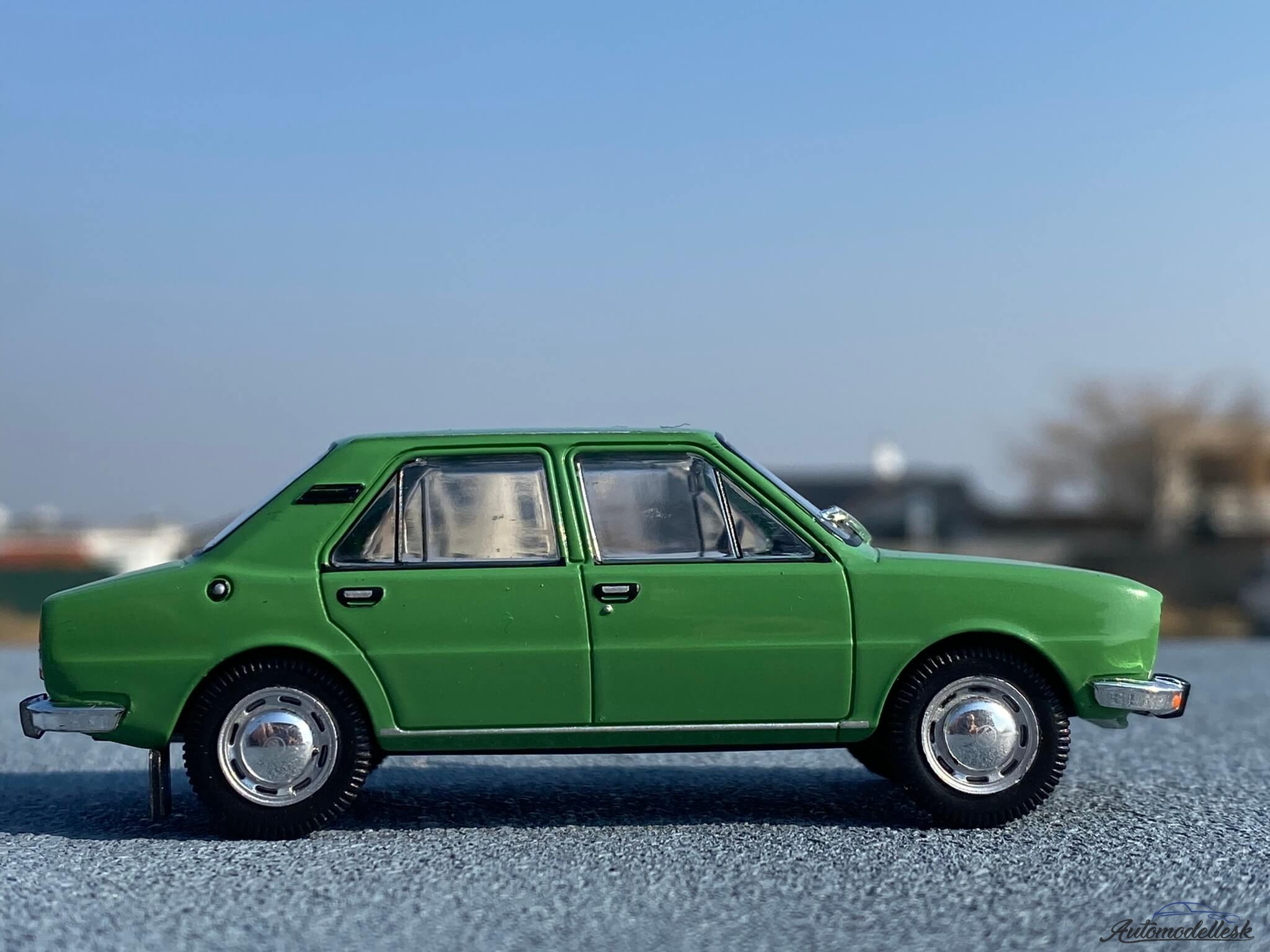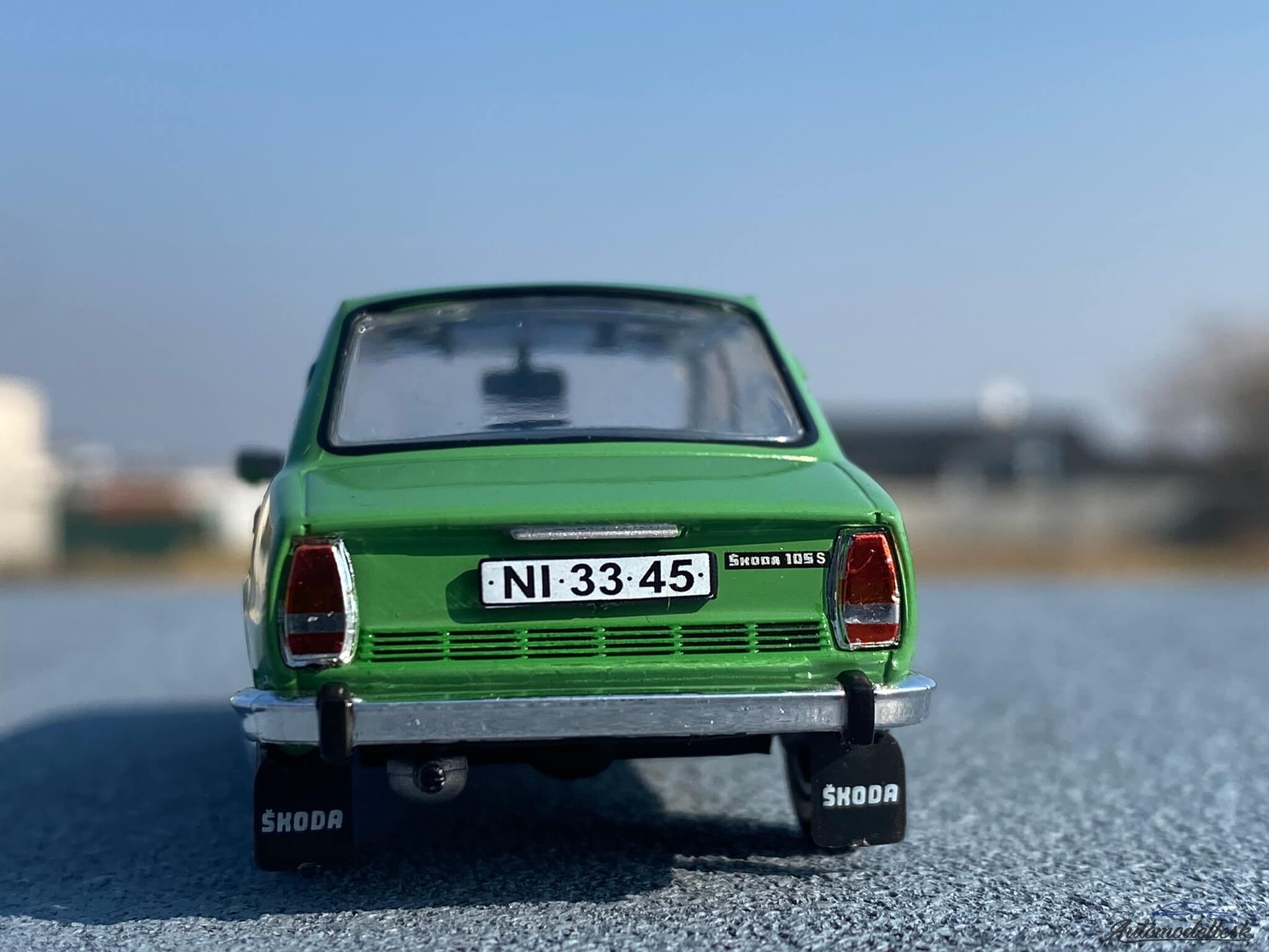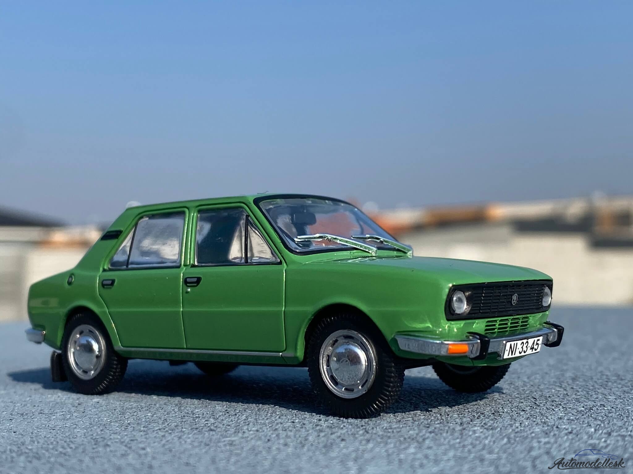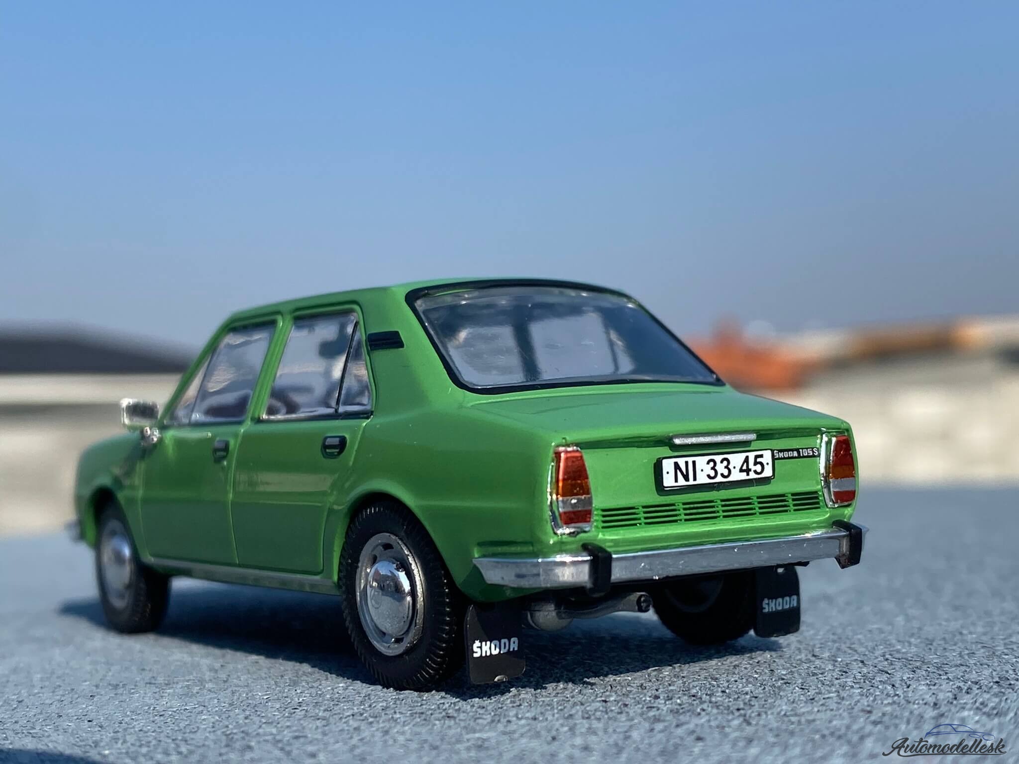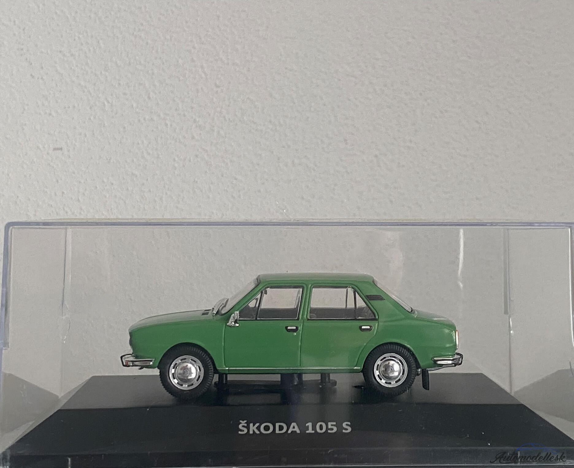 Model auta ŠKODA 105S, zelená ( vo vitríne). Mierka 1:43. DeAgostini. Balenie model je na podstavci vo vitríne.