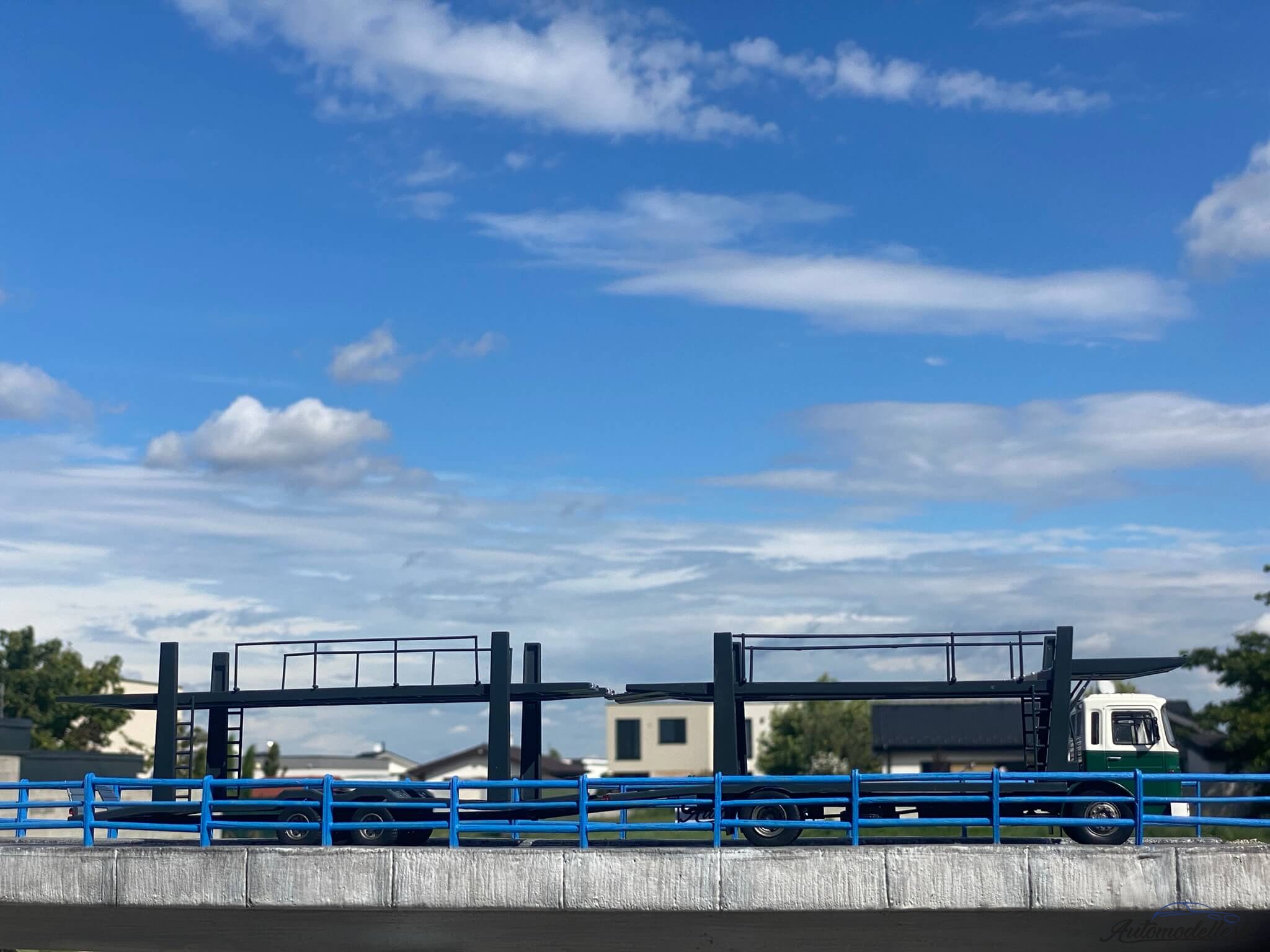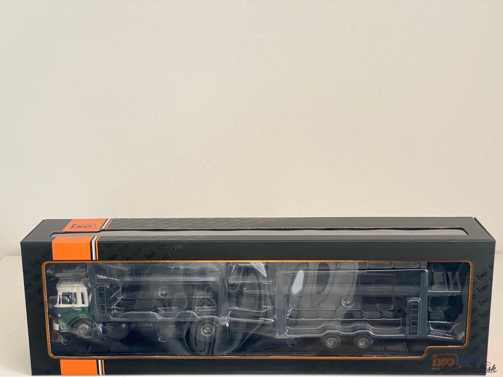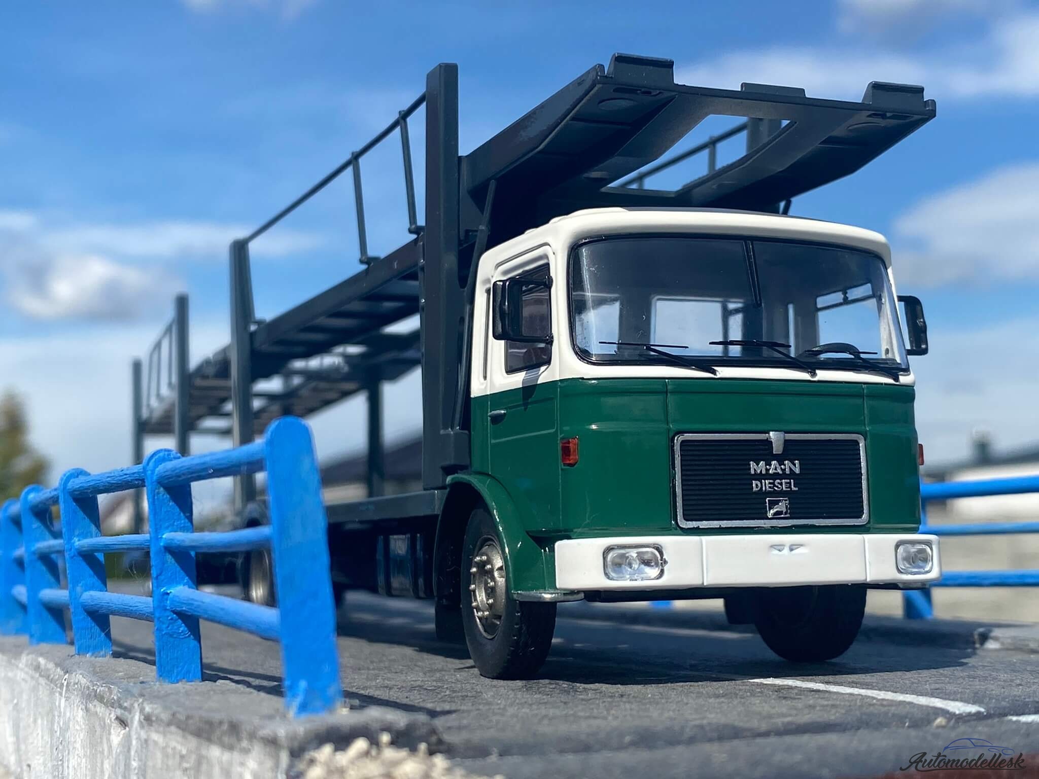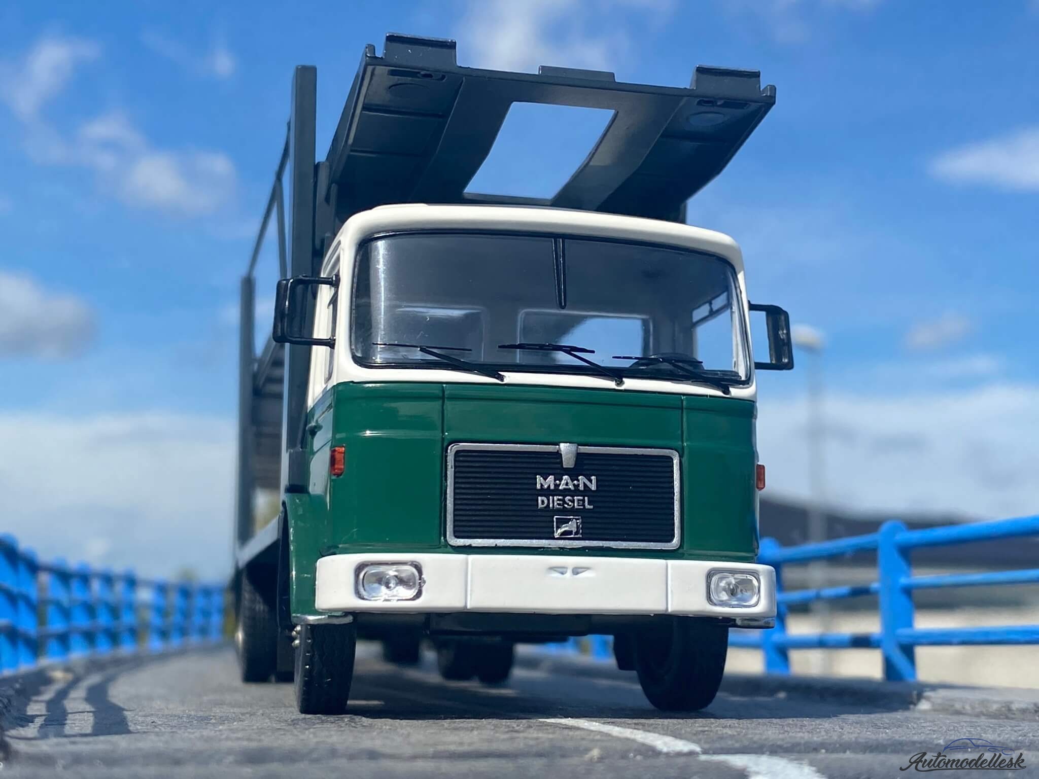 Model kamiónu MAN Auto transporter s prívesom, zelená/biela. Mierka 1:43.