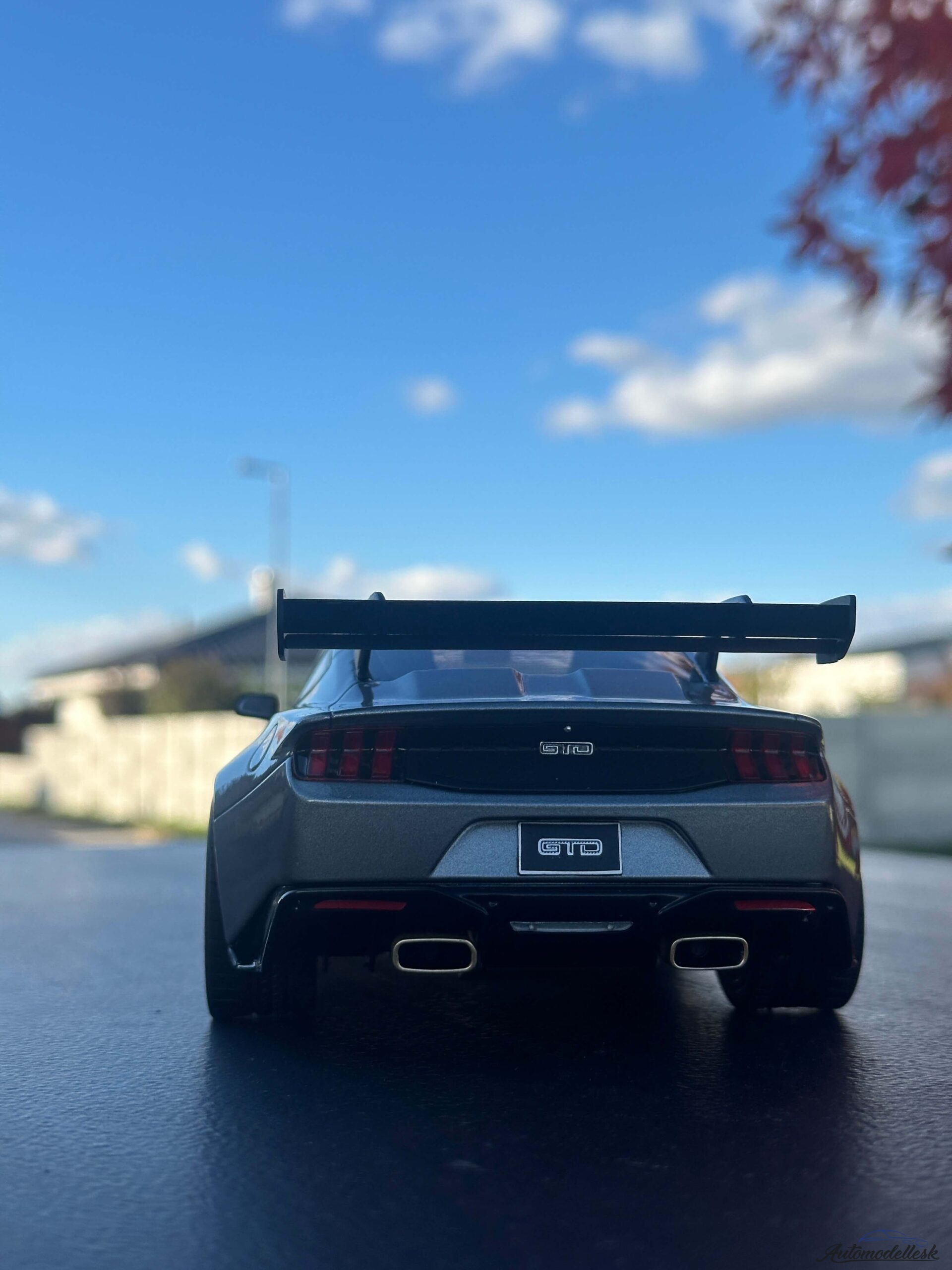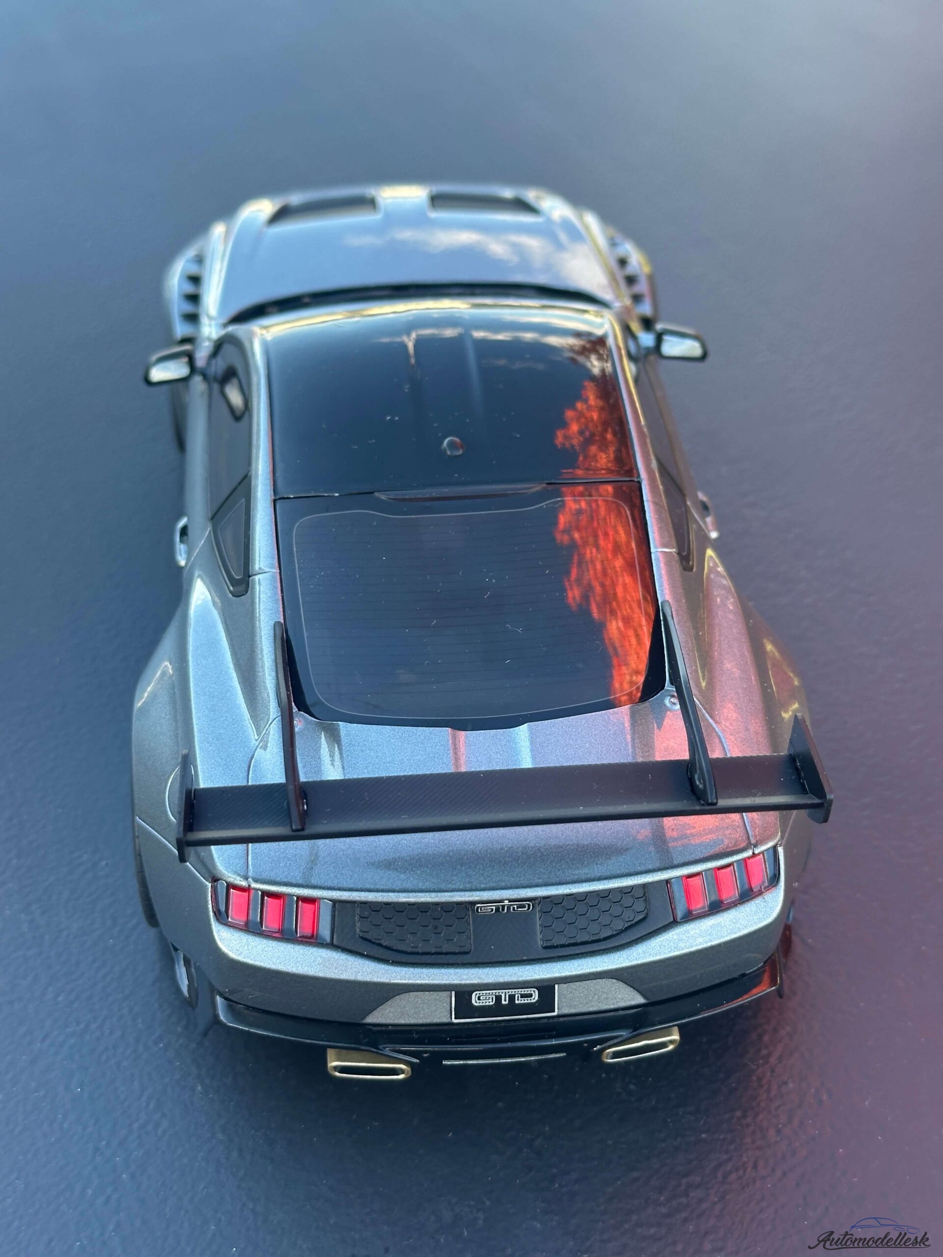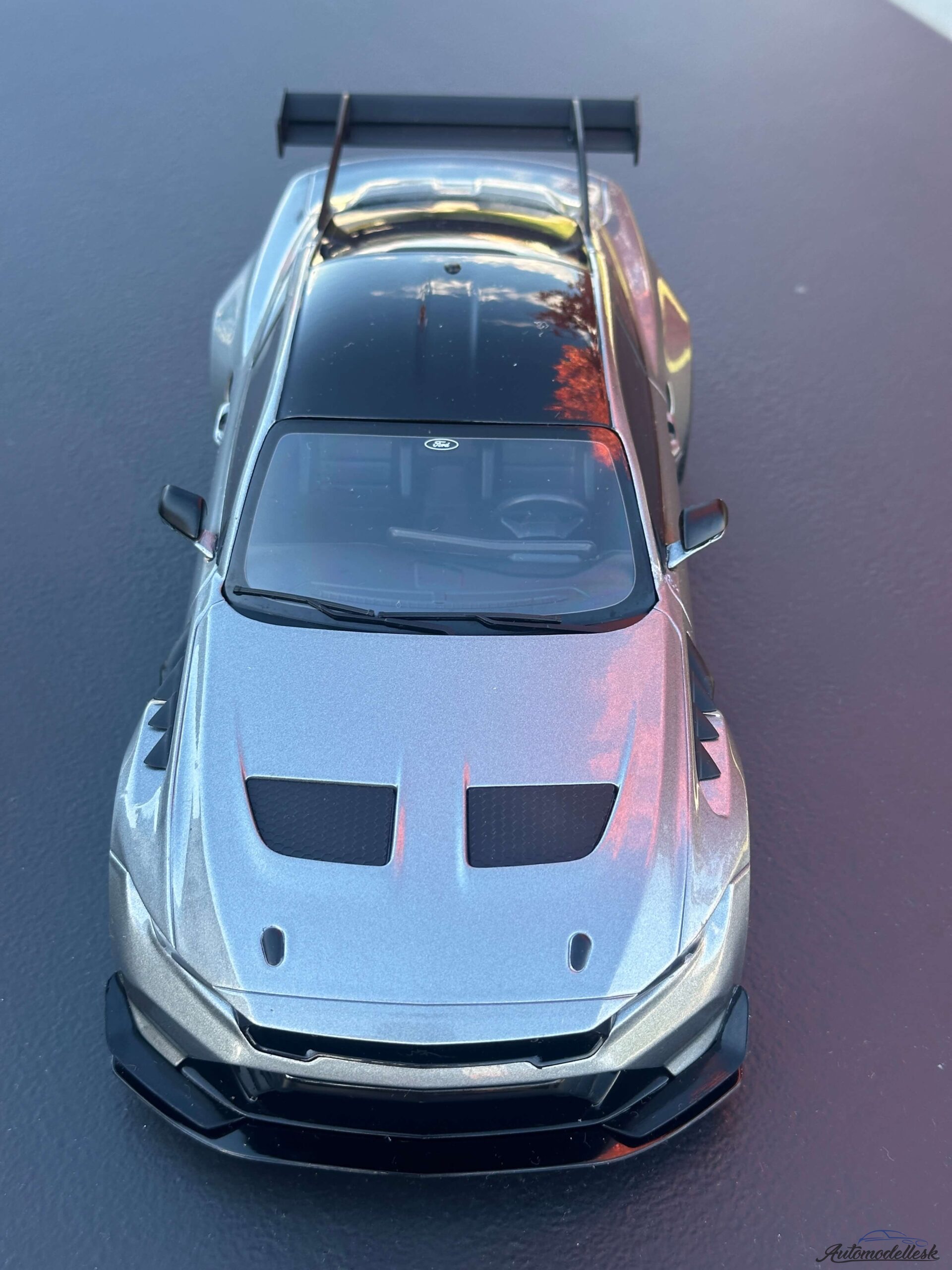 Model auta Ford Mustang GTD, 2025, tmavo šedá. Mierka 1:18.