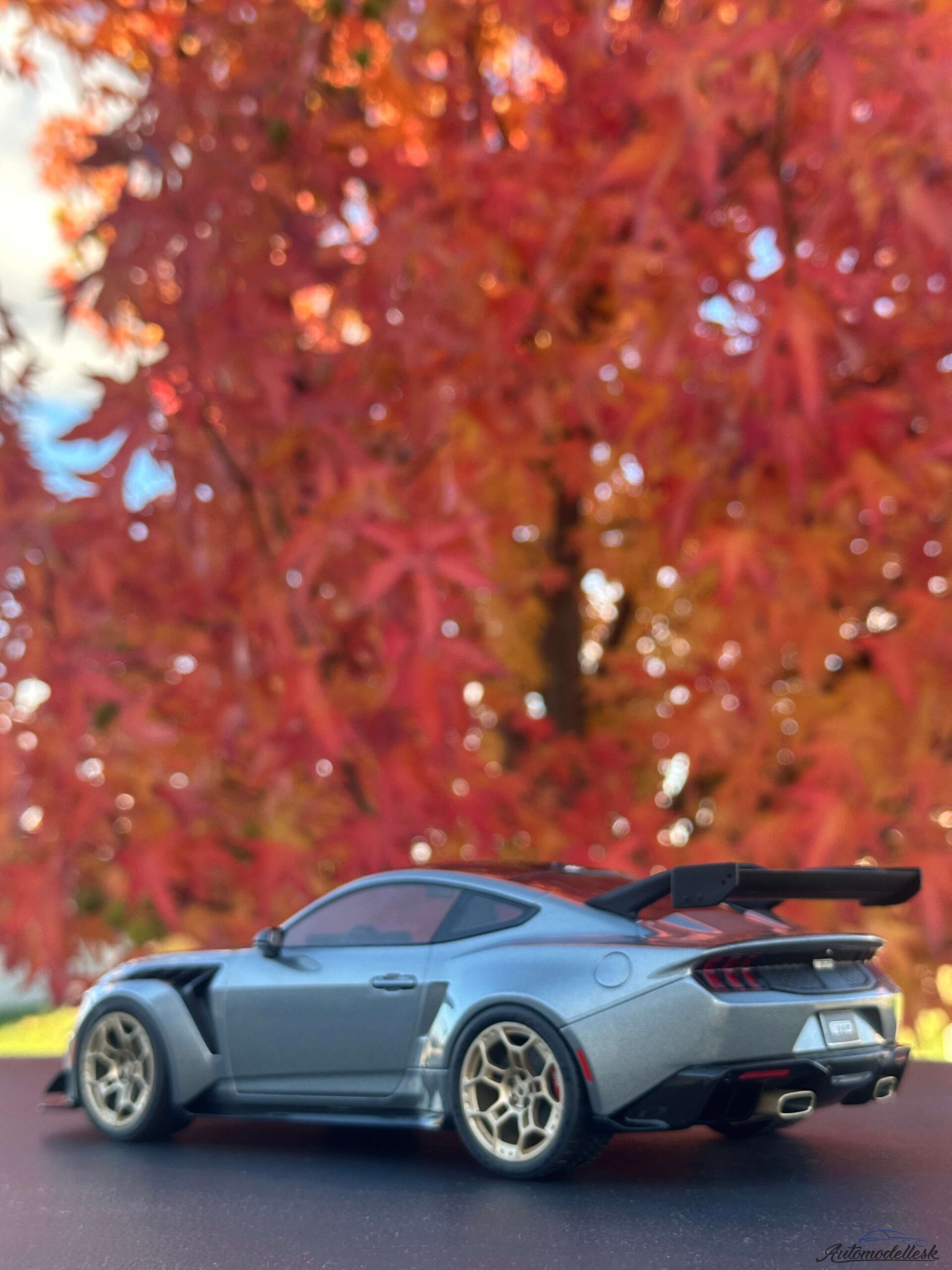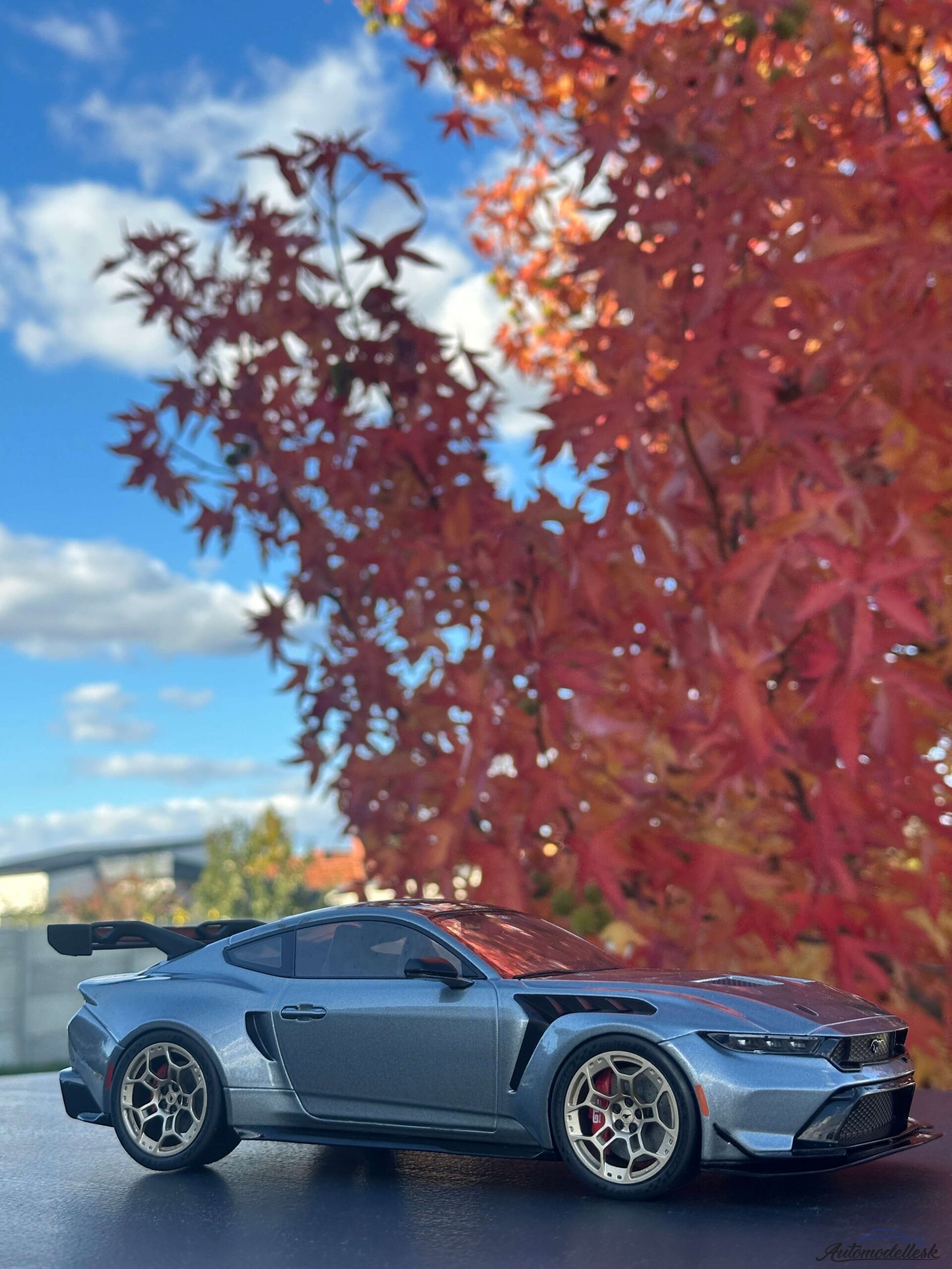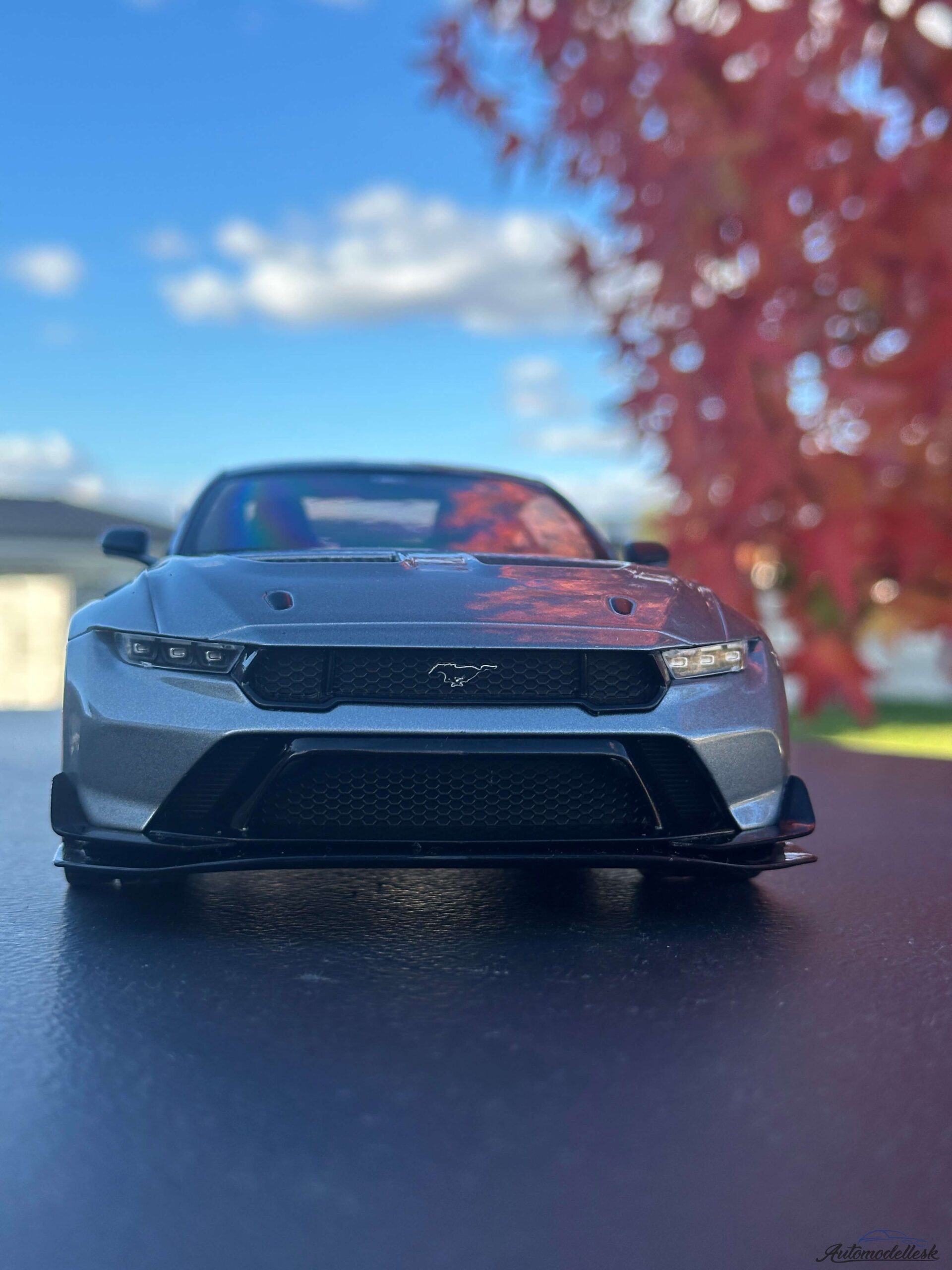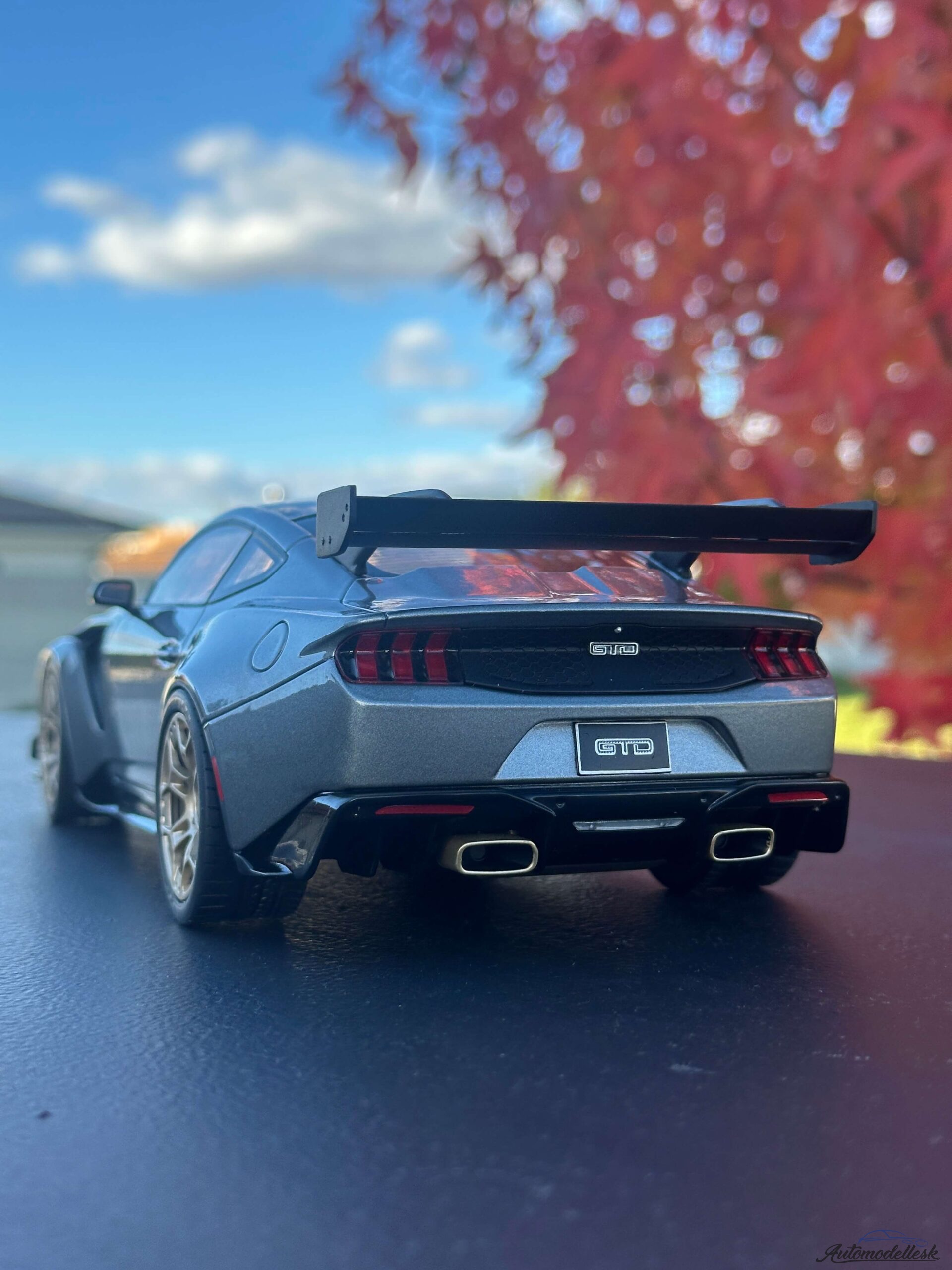 Model auta Ford Mustang GTD, 2025, tmavo šedá. Mierka 1:18.